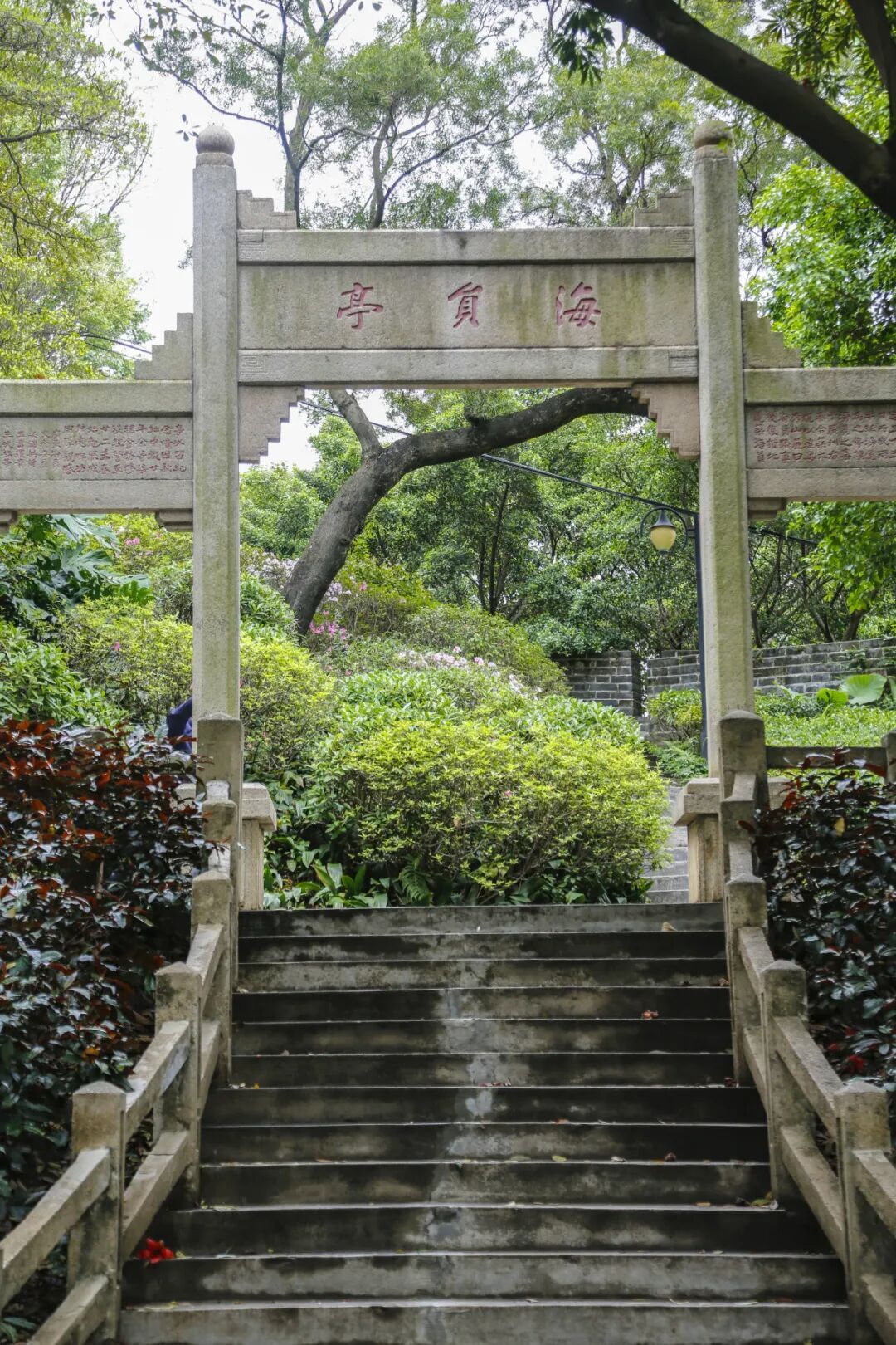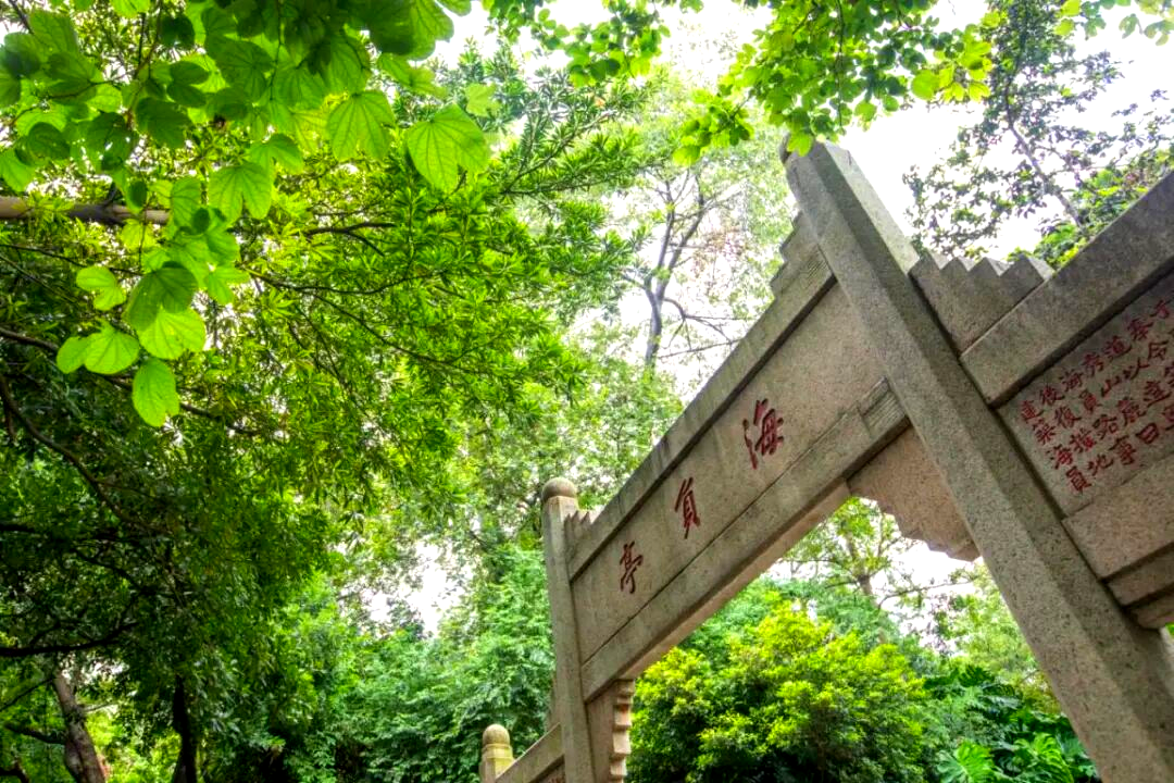 从镇海楼出来,沿着镇海路往仲元楼方向走,右边山坡上有一座花岗岩四柱三间式的牌坊,额上镌刻“海员亭”三个红色楷书大字。