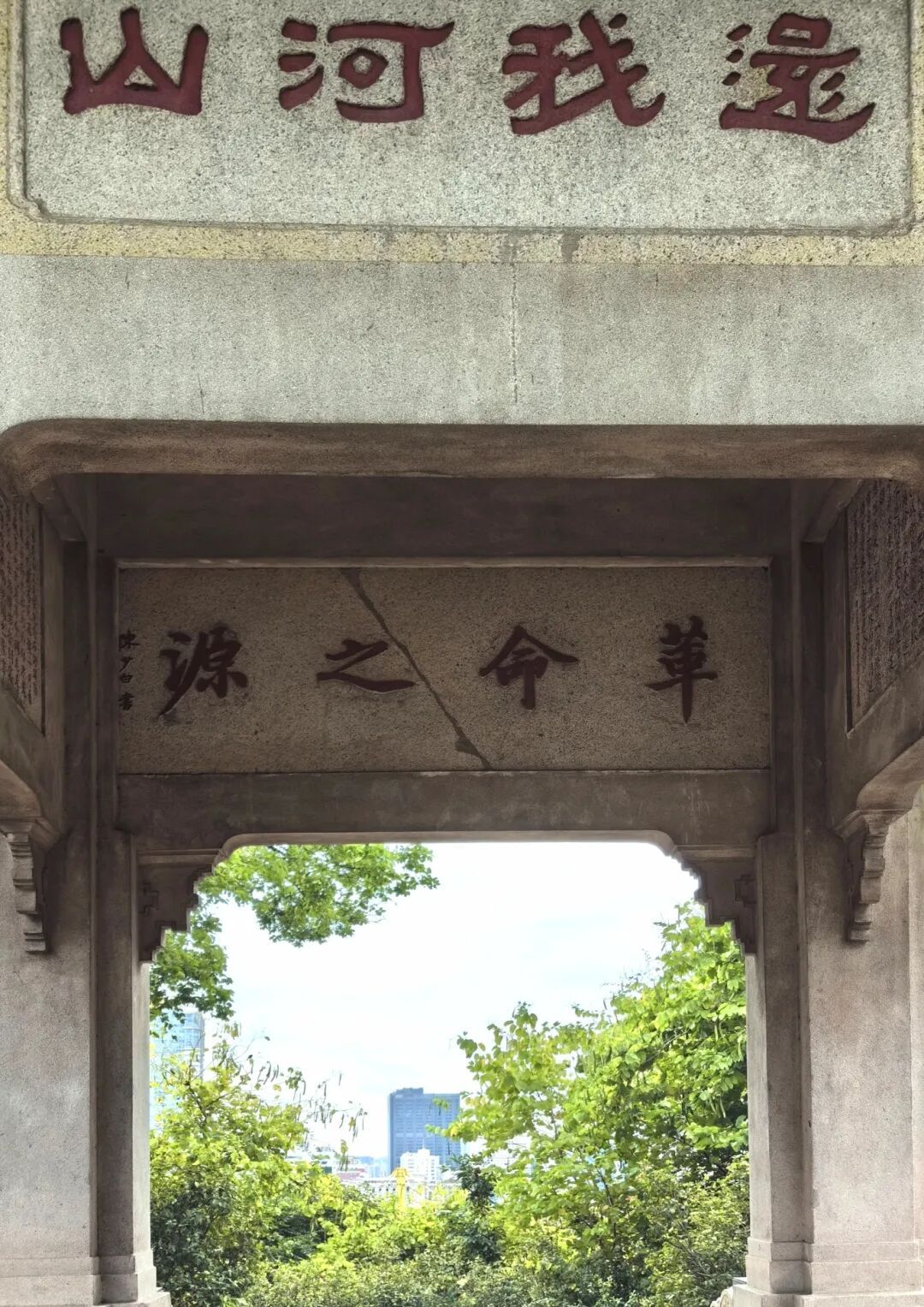 其他三面石额,皆是红红的一片文字,内容为《粤秀山上光复纪念石坊跋语》(越秀山亦名粤秀山)。亭后额另嵌石一方,外仿刻岳飞“还我河山”,内刻邓仲泽等撰的《建造光复纪念亭梗概》。