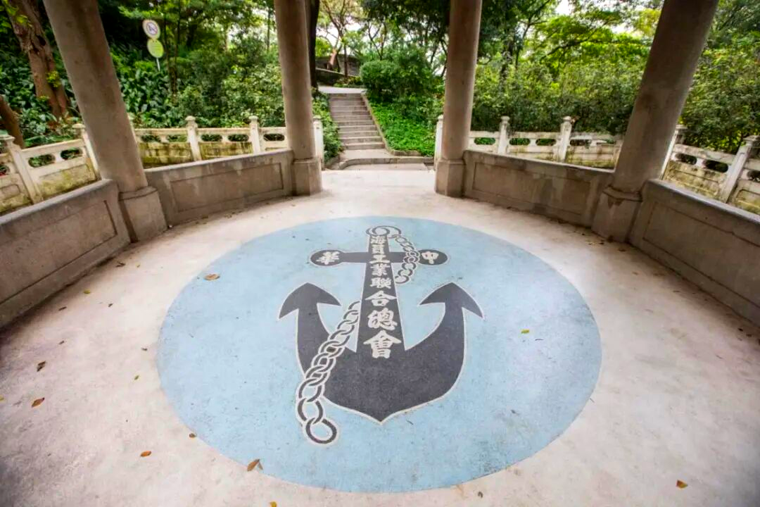 沿着古城墙漫步,很快就见一方形平台,平台上建有一座重檐八角的尖顶亭,亭中立八根白石圆柱,亭顶覆盖着绿色琉璃瓦,这便是海员亭了。走进亭子,地面上绘有一个蓝色圆圈,圆圈上画着粗粗的黑色铁锚,拴着黑色的铁链,还描着白色大字“中华海员工业联合总会”。