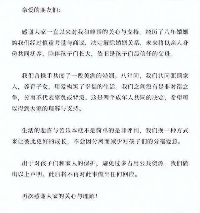 2023年10月,两人宣布离婚,过程没有撕破脸,也没有互相指责,声明中满是祝福,整件事情处理得体面而低调,令人意外。尽管这段曾经为章子怡赌上一切的婚姻以遗憾收场,但离婚后的两人,却以截然不同的方式继续生活。
